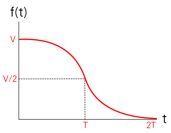 <table><thead><tr><th width="229">Scenario</th><th>Result</th></tr></thead><tbody><tr><td>t = 0</td><td>f(t) -> V</td></tr><tr><td>0 &#x3C; t &#x3C; T</td><td>f(t) decreases with t, the rate of descending increases</td></tr><tr><td>t = T</td><td>f(t) = V/2</td></tr><tr><td>t > 2T</td><td>f(t) -> 0</td></tr></tbody></table>